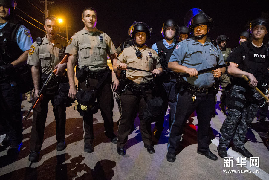 8月19日,警察在美国密苏里州弗格森警戒。当日,继18岁黑人青年迈克尔·布朗9日下午被警方射杀后,密苏里州圣路易斯市北部一非洲裔男子19日中午因涉嫌持刀袭警,被警察击毙,导致弗格森街头抗议升级。新华社发(沈霆摄)