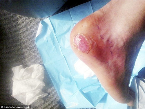 报道指出,坎贝尔右脚跟今年4月出现水泡,其母亲只在患处涂上医治脚疣的药膏。不料第二天,坎贝尔的足部开始肿胀,全身出现红斑,体温上升。焦急的母亲立刻带他到医院。