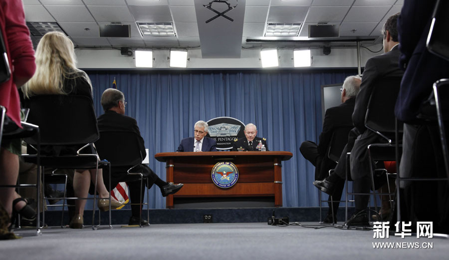 8月21日,美国国防部长哈格尔(左)和美军参谋长联席会议主席登普西在华盛顿五角大楼出席新闻发布会。哈格尔当日表示,“伊拉克和黎凡特伊斯兰国”极端组织不是传统的恐怖组织,它超越了“基地”组织,造成了前所未见的恐怖威胁。新华社记者 殷博古 摄
