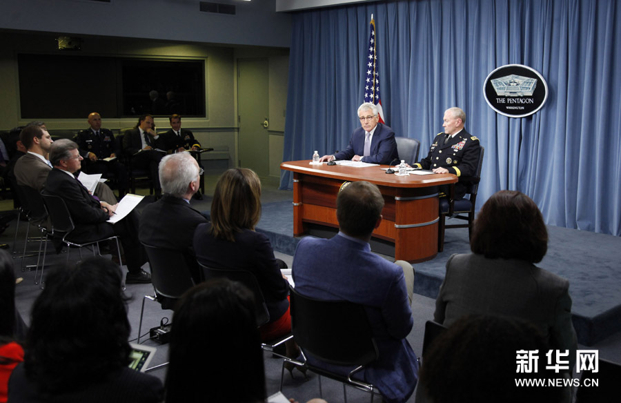 8月21日,美国国防部长哈格尔(左)和美军参谋长联席会议主席登普西在华盛顿五角大楼出席新闻发布会。哈格尔当日表示,“伊拉克和黎凡特伊斯兰国”极端组织不是传统的恐怖组织,它超越了“基地”组织,造成了前所未见的恐怖威胁。新华社记者 殷博古 摄