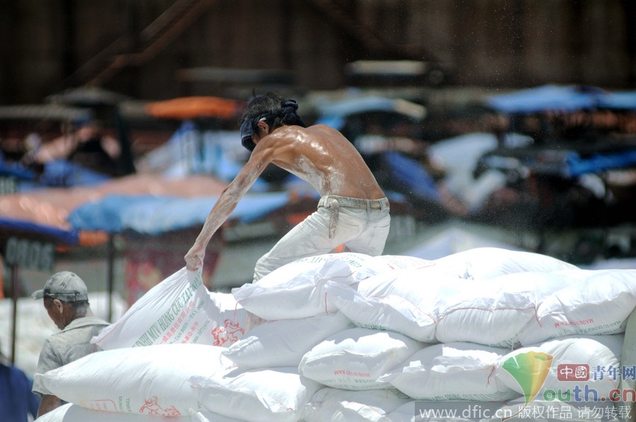 东兴市每天有3000多名边民固定到越南芒街“上班”,越南芒街也有数千边民到中国东兴“上班”。每周的星期一到星期五,在界河边的东兴边民互市贸易区,总会有几百名来自中越两国的装卸工人,将越南进口的木薯粉从船上把扛上岸,装到货车上,通过边检口岸运进国内,销往各地。在装卸过程中,木薯粉飘落,装卸工人的头发、脸部和衣服都花白如雪,被人们称为"灰小伙"。由于木薯粉灰尘太大,装卸工人没有戴口罩,年复一年就会影响身体健康。他们每天能赚到100多元人民币的工钱,虽然来自两个不同的国家,语言也各异,但这些工人同在一个码头劳动、生活,相处十分和谐。广西东兴市与越南芒街市隔河相望。随着中国-东盟自由贸易区的全面启动,中越两国的边贸关系更加密切。