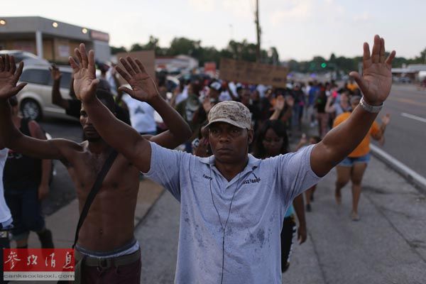 18日,弗格森民众在游行中高举双手,抗议黑人青年布朗在手无寸铁的情况下遭警察射杀。