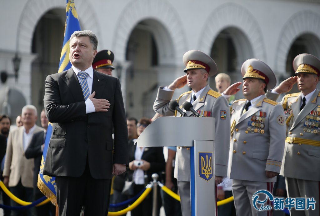 当地时间2014年8月24日,乌克兰基辅,乌克兰举行独立日阅兵,总统波罗申科到场。