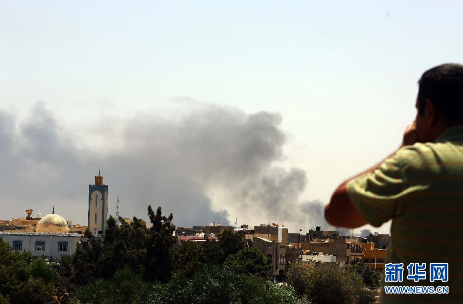 8月14日,火箭弹击中了油库,燃起的黑烟弥漫了的黎波里上空。新华社报道员哈姆扎·图尔基亚 摄