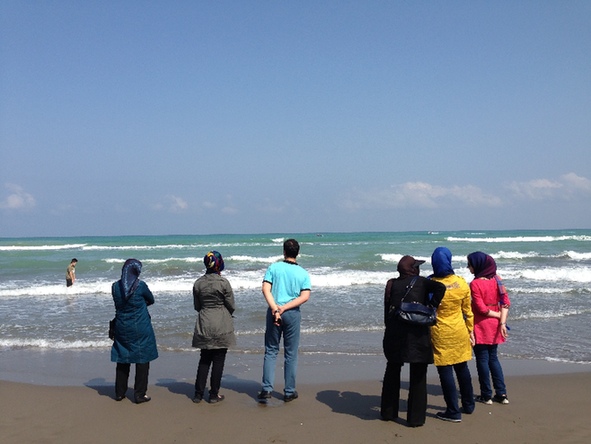 伊朗一家大小在里海沙滩边眺望。里海是伊朗人假期休闲的首选。