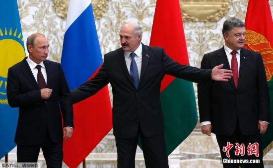 在白俄罗斯首都明斯克26日即将召开国际会议前夕,与会的俄罗斯总统普京与乌克兰总统波罗申科握手致意。图为俄罗斯总统普京(左)、白俄罗斯总统卢卡申科和乌克兰总统波罗申科(右)准备合影。