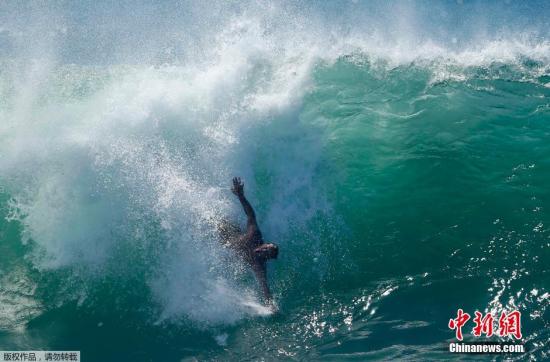 原标题:飓风在美国南加州掀起巨浪 冲浪迷乘风破浪(图)