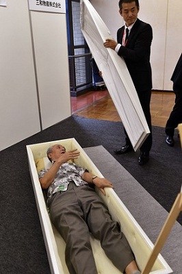 原标题:日本举办殡葬展 参观者躺进棺材体验身后服务(图)