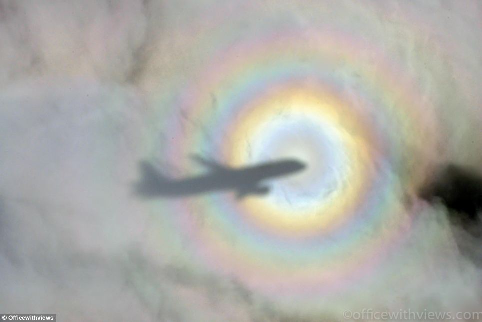 飞机投影在云层上,镜头四周形成了光晕。