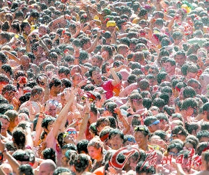 今年的番茄大战与往年一样,热闹非凡,逾2.2万名“战士们”拿着倾倒在地面上的大量西红柿作为“弹药”,开始向旁边的同伴们或陌生人“开战”,仅一个小时约140吨熟透的番茄被消耗掉,“战士们”的衣服全部被西红柿汁浸染,小镇街道瞬间成为红色的海洋。
