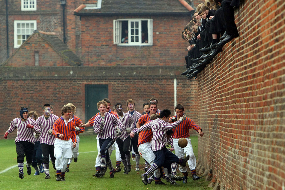 伊顿公学的男生们坐在墙头观看传统“墙赛”。这项只有伊顿才有的特殊比赛看起来像橄榄球和足球的复杂混合体。比赛就在这堵110米长砖墙边的狭长球场上展开,双方沿着墙争夺球的控制权,以期获得相对罕见的得分机会。