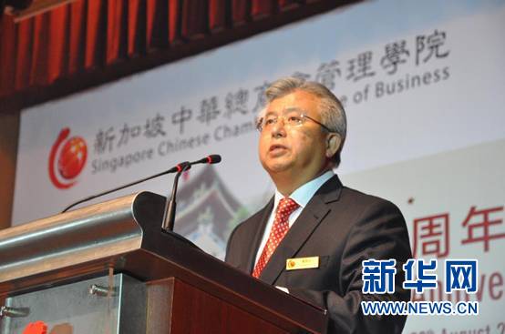 图为8月29日,新加坡中华总商会管理学院成立三十周年晚宴上,新加坡中华总商会会长蔡其生先生致辞。