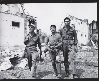 杰拉尔德·克瑞甘上尉以及霍华德·格里高里上尉,与他们的中国朋友从缅甸腊戍的废墟走出来。他们隶属于第5野战炮团。