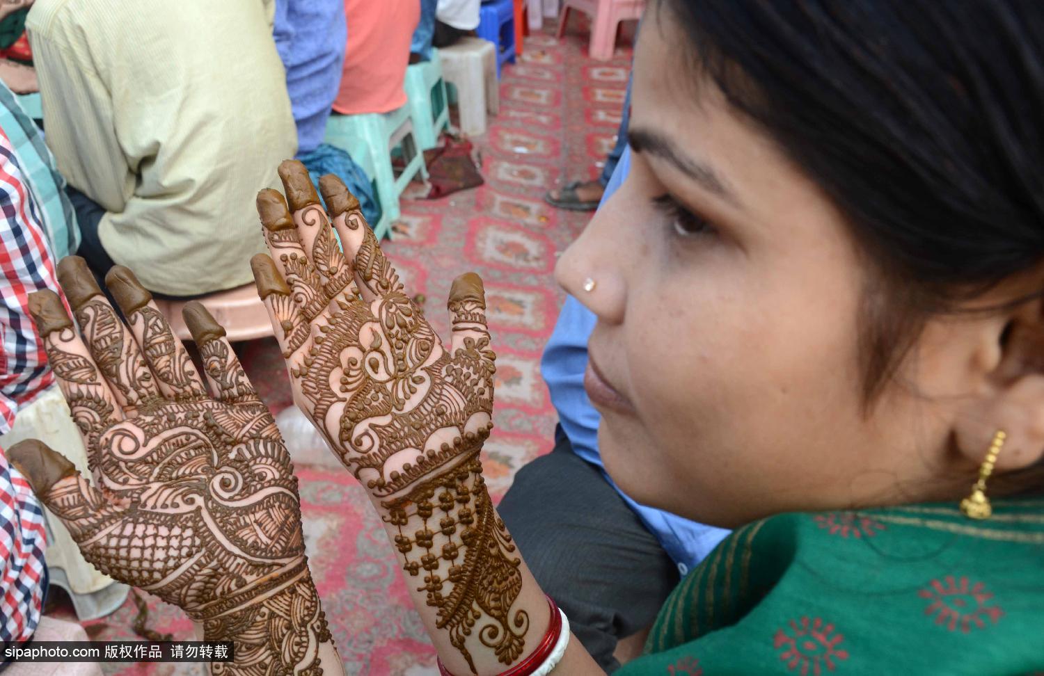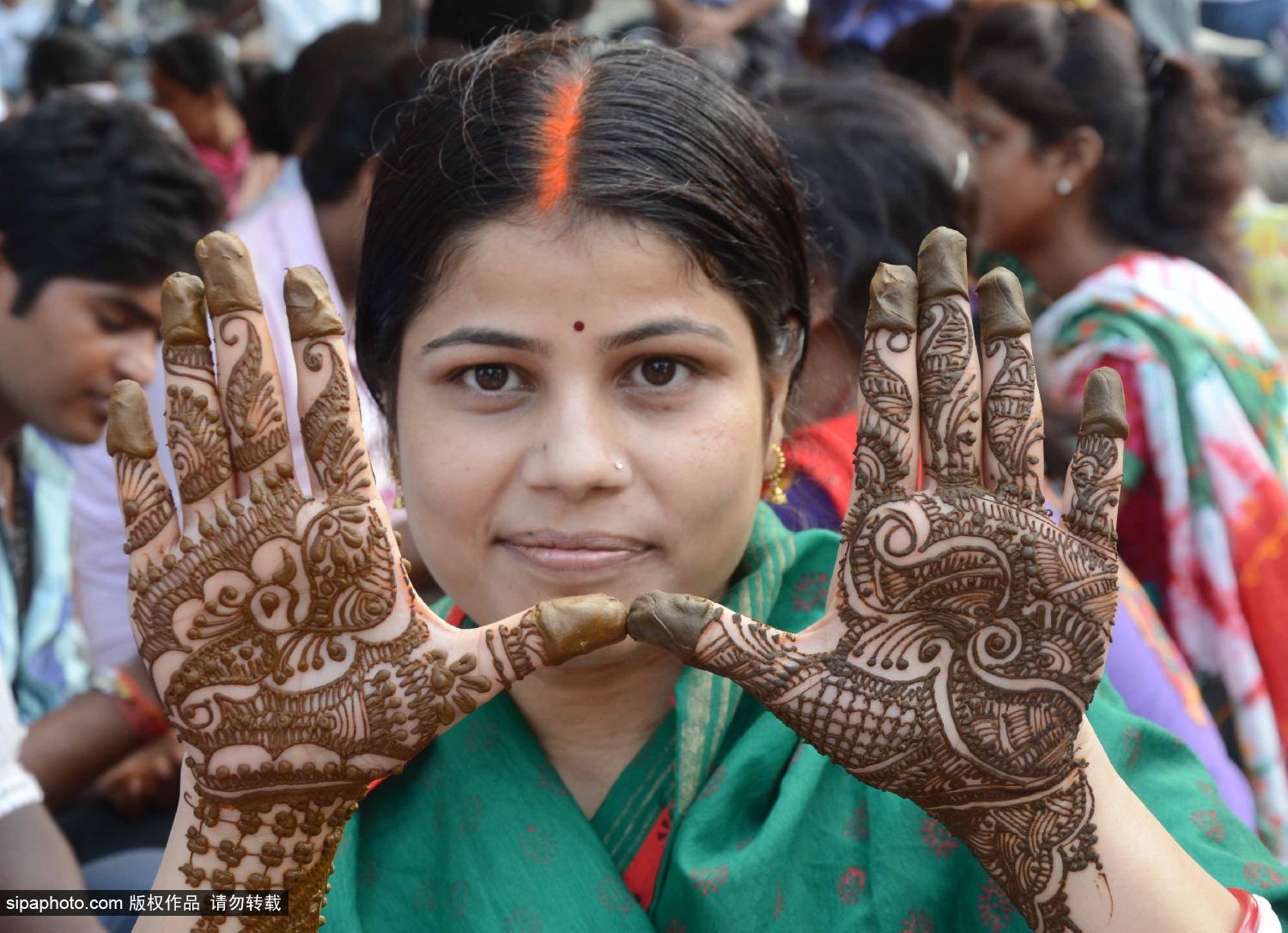 当地时间2014年8月27日,印度安拉阿巴德,当地女性在“提吉节”(Teej Festival)前夕在手部做海娜纹身(绘在皮肤上的装饰图案),以此方式来为自己的丈夫长寿祈福。