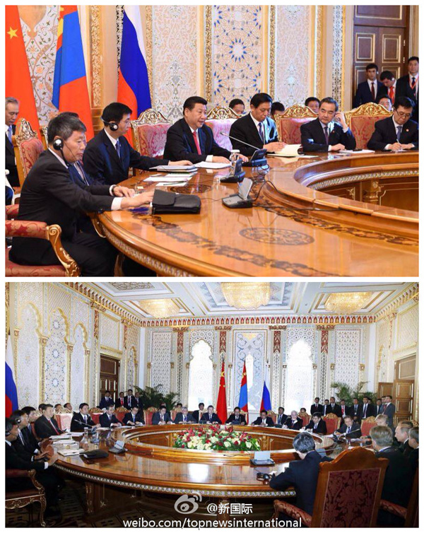 新华网北京9月12日电 据新华社“新国际”微博报道,国家主席习近平11日在出席中俄蒙三国元首会晤时说,中方提出共建丝绸之路经济带倡议,获得俄方和蒙方积极响应。我们可以把丝绸之路经济带同俄罗斯跨欧亚大铁路、蒙古国草原之路倡议进行对接,打造中蒙俄经济走廊。