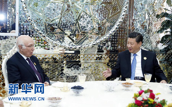 新华网杜尚别9月12日电(记者侯丽军 刘红霞)9月12日,国家主席习近平在杜尚别会见巴基斯坦总理国家安全和外事顾问阿齐兹。