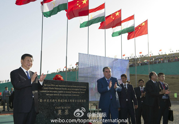 新华网北京9月14日电 据新华社“新国际”微博报道,习近平主席13日在杜尚别出席中国—中亚天然气管道D线塔境内段开工仪式。该段全程410公里,穿越险峻的帕米尔高原,是全线建设的重点和难点。习近平向中塔工程人员表示崇高敬意。他表示,相信这条象征着友谊的能源大动脉一定能如期建成,成为互利友好合作又一座丰碑。