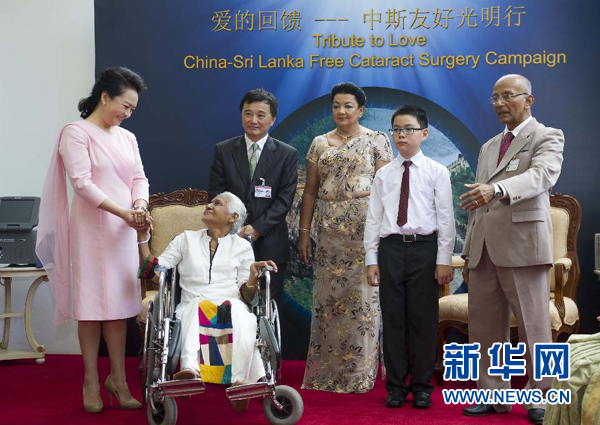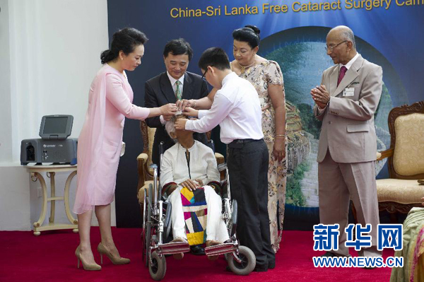 在两国元首夫人共同见证下,许鹏飞为一位接受复明手术的斯里兰卡白内障患者揭开纱布。彭丽媛和施兰蒂向在场的斯里兰卡复明患者致以问候和祝福。彭丽媛向斯方赠送白内障手术仪器,鼓励“中斯友好光明行”活动继续谱写中斯友好交往的佳话。