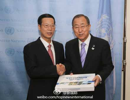 新华网北京9月23日电 据新华社“新国际”微博报道,国家主席习近平特使、国务院副总理张高丽22日在联合国总部与联合国秘书长潘基文共同出席中国政府向联合国捐赠30米分辨率全球地表覆盖数据仪式。张高丽表示,中国政府正式将世界上首套30米分辨率全球地表覆盖数据捐赠给联合国,这是为即将举行的气候峰会带来的一份礼物。