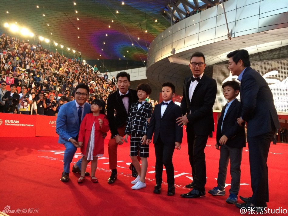 北京时间10月2日17时,第19届釜山电影节在韩国釜山开幕。图为《爸爸去哪儿》第一季张亮、郭涛、王岳伦以及韩国演员成冬日携孩子们亮相。(图片来源:新浪娱乐)