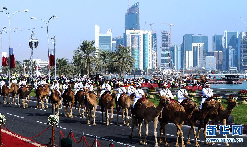 2013年12月18日,卡塔尔士兵骑着骆驼在首都多哈参加国庆阅兵式。当日是卡塔尔国庆节,卡塔尔在多哈的海边大道举行盛大的国庆阅兵式。 新华社发(陈少金 摄)