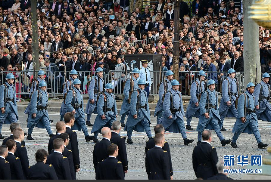 7月14日,在巴黎举行的国庆日阅兵仪式上,身着一战时期军服的法国士兵亮相香榭丽舍大街。新华社发(埃蒂安·洛朗 摄)