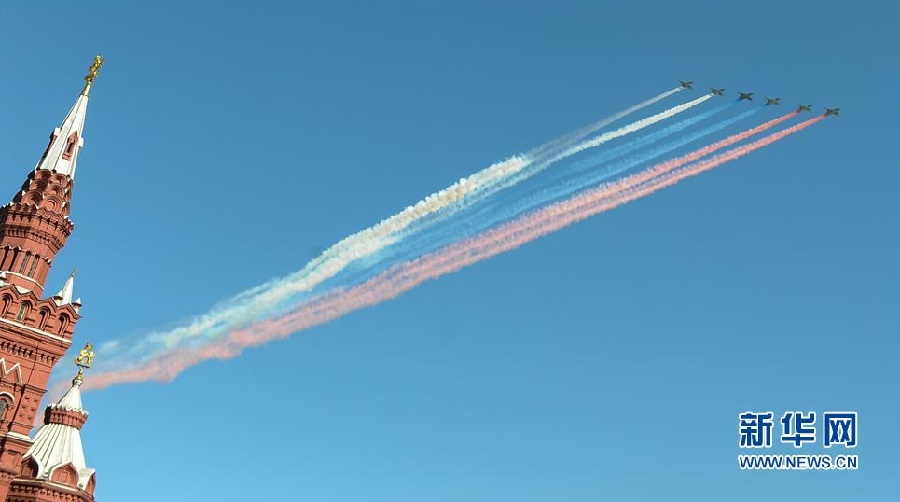 5月9日,在莫斯科红场,俄罗斯战机飞过纪念卫国战争胜利69周年的阅兵式上空。 新华社记者贾宇辰摄