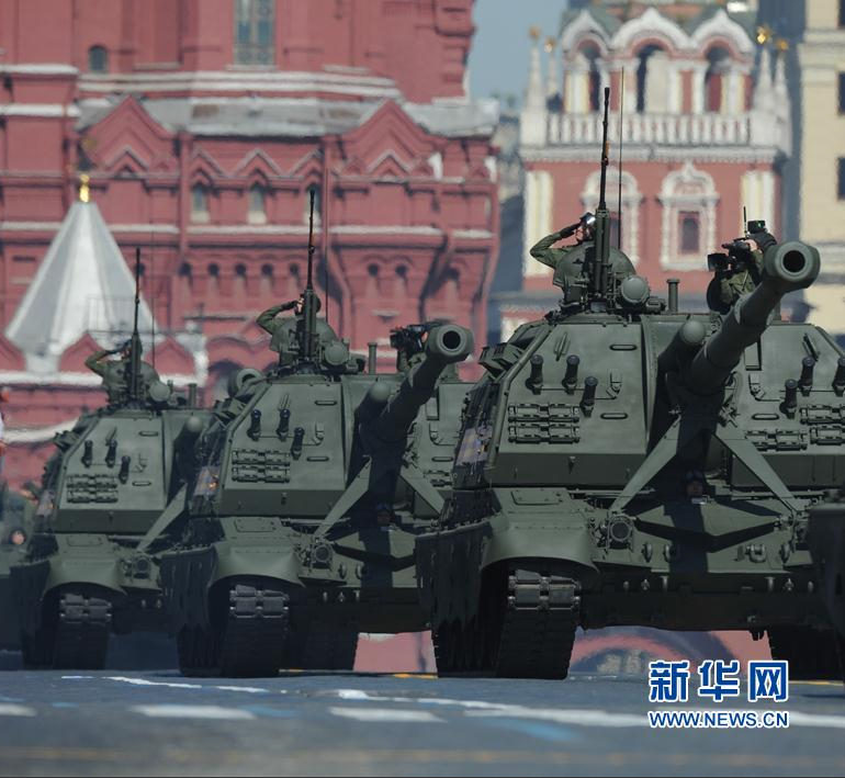 5月9日,在莫斯科红场,MCTA-C型号自行榴弹炮方队通过红场。 当日,俄罗斯举行阅兵纪念卫国战争胜利69周年。 新华社记者戴天放摄