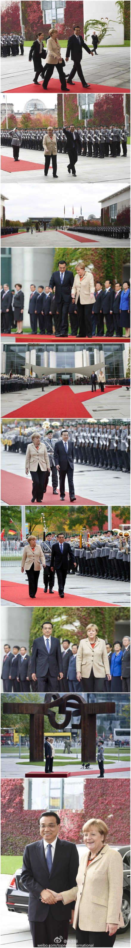 新华网北京10月10日电 据新华社“新国际”微博报道,当地时间10月10日,德国总理默克尔在总理府举行隆重欢迎仪式,欢迎李克强总理的来访。仪式上奏起两国国歌,李克强在默克尔陪同下检阅了仪仗队。