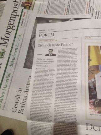 柏林市中心亚历山大地铁站的书报店里,洛塔尔·沙尔夫拿起一份报纸递给我们:“今天的《世界报》上有你们总理发表的文章。”