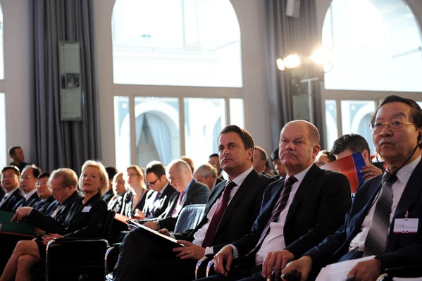 卢森堡首相贝特尔(右三)、汉堡市市长舍尔茨(右二)、中国工业经济联合会会长李毅中(右一)出席第六届汉堡峰会开幕式。新华社记者商婧摄