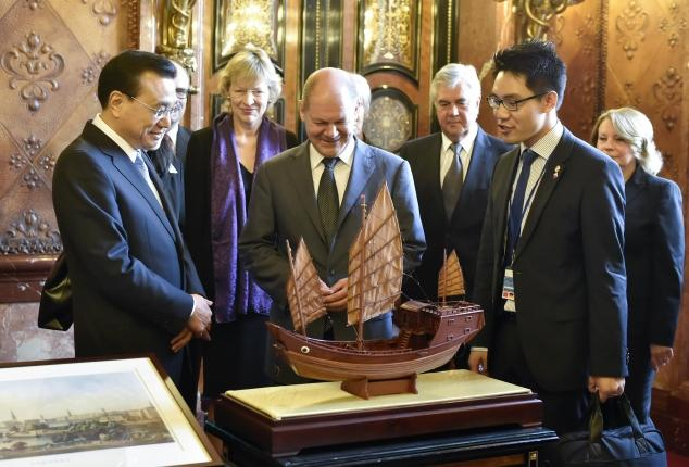 汉堡市政厅里,克强总理将一艘明代商船的复制模型,赠给汉堡市市长肖尔茨。