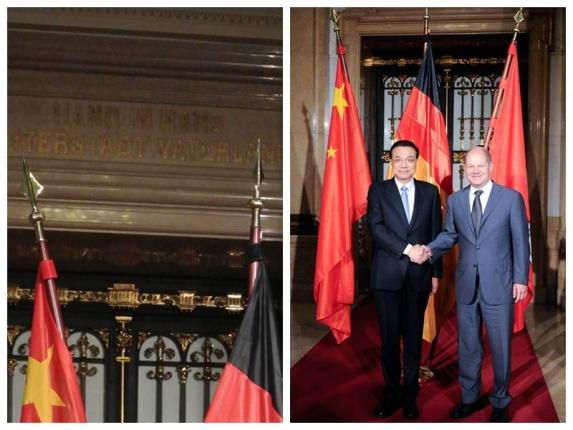 市政厅里,站在代表中国、德国和汉堡的三面旗帜前,克强总理与肖尔茨市长的手紧紧相握。在他们的身后,大门门楣上镌刻着这样一句话“hand in hand”。