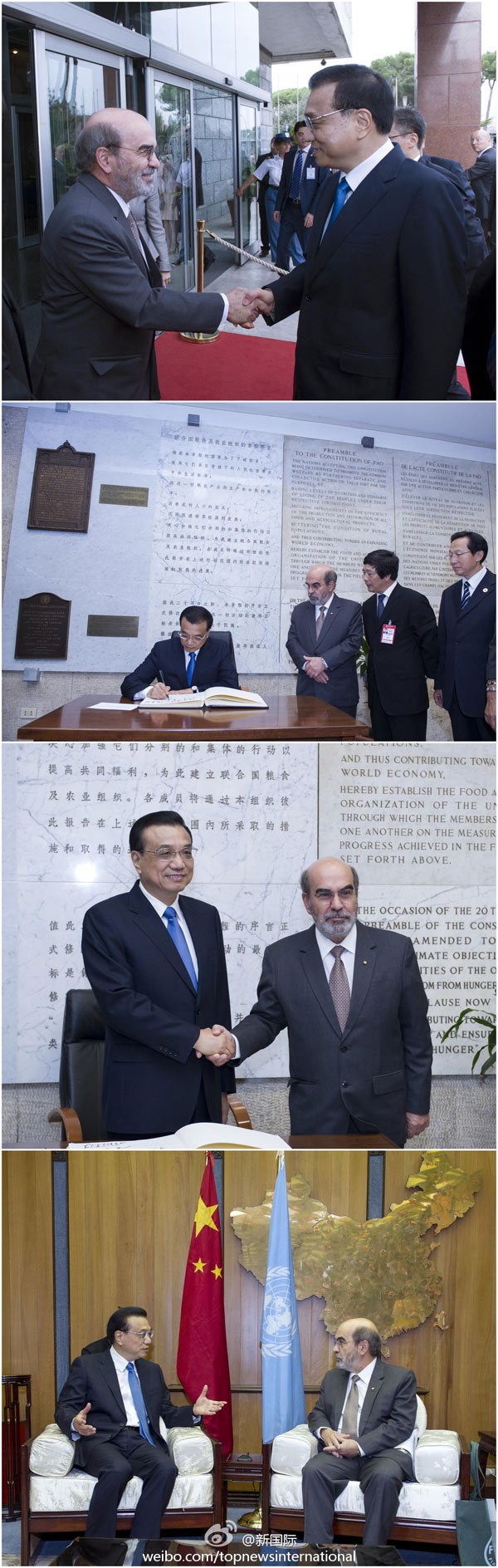 新华网北京10月15日电 据新华社“新国际”微博报道,应联合国粮农组织总干事格拉齐亚诺的邀请,李克强总理在世界粮食日前夕,来到位于罗马的粮农组织总部访问,与格拉齐亚诺会见并发表演讲。这是李克强就任总理后首访联合国组织,也是中国总理首次访问粮农组织总部。