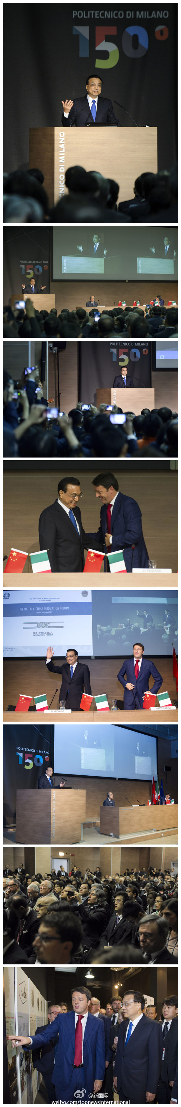 新华网北京10月16日电 据新华社“新国际”微博报道,李克强总理16日在意大利总理伦齐陪同下在米兰理工大学出席中意创新周大会时说,我们的时代是创新的时代,科技创新不仅来自对科学的了解,对技术的把握,也源自创意,希望中意青年用东西方智慧碰撞出更多“奇思妙想”,让创意促进创新,进而提升两国产业竞争力。