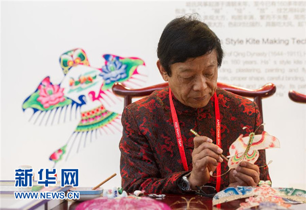 11月4日,北京哈氏风筝传人哈亦琦在位于国家会议中心的展位上制作风筝。作为2014年亚太经合组织(APEC)领导人会议周的主要会场之一,国家会议中心的装饰布置充满“京味儿”,彰显出主办城市的鲜明特色。新华社记者 罗晓光 摄