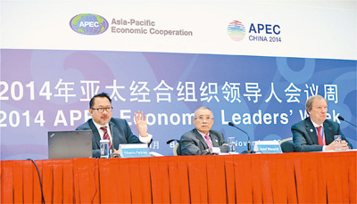 11月7日,太平洋经济合作理事会在北京国家会议中心举行新闻吹风会,记者在现场踊跃提问。本报记者 雷 声摄
