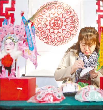 APEC领导人会议周期间,民间艺术家在国家会议中心“品味北京”展区演示脸谱绘制艺术。新华社记者 罗晓光摄