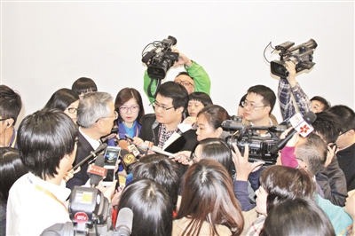 在太平洋经济合作理事会新闻吹风会后,各路记者争相进行补充采访。 本报记者 刘 刚摄