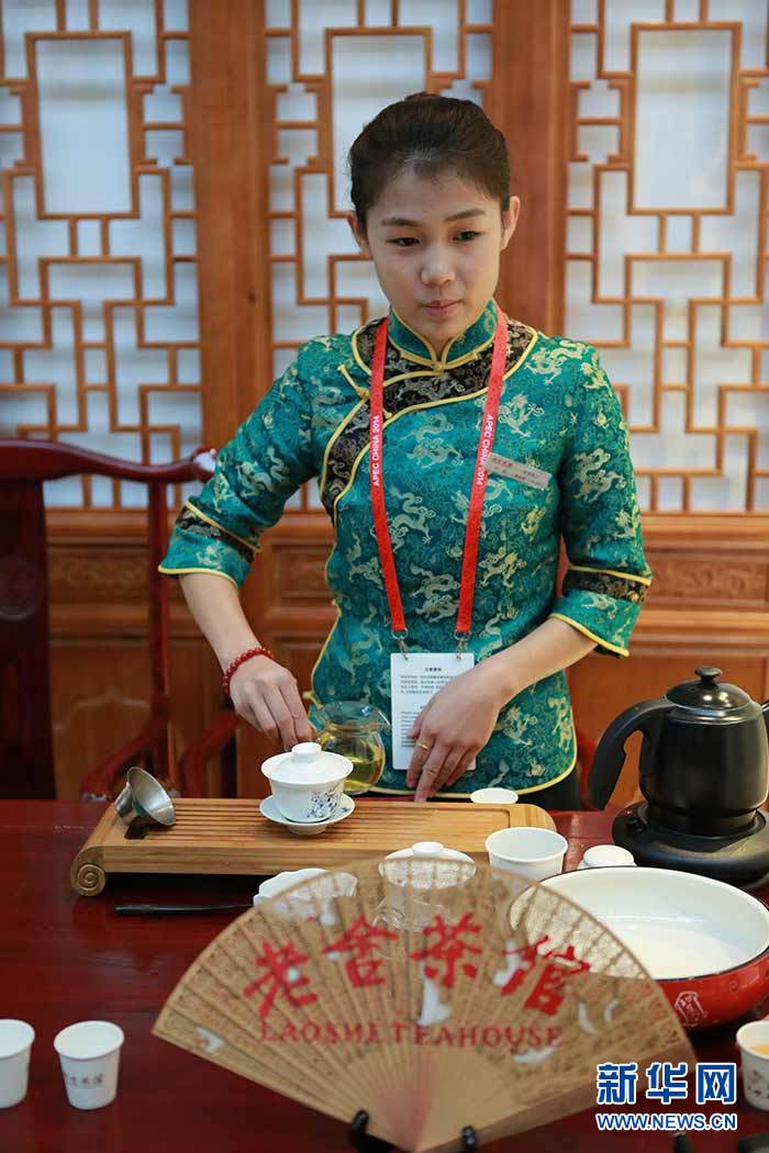 北京老舍茶馆派出一位美丽的姑娘,为中外媒体人展示中国茶艺。 新华网 王帅 摄