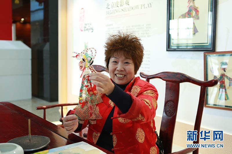 北京皮影剧团艺术家陶淑珍在展示作品 新华网 王帅 摄