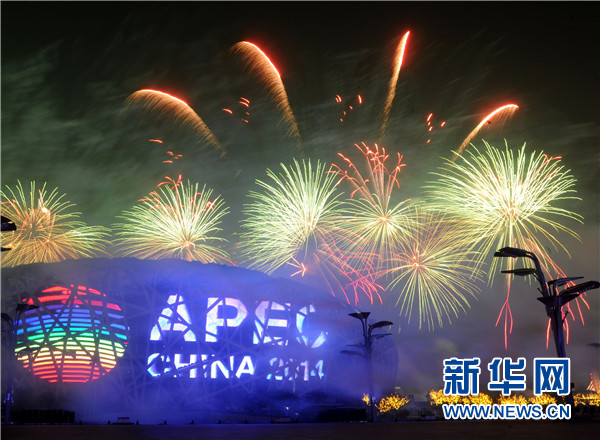 11月10日,北京在奥林匹克公园举行焰火表演。亚太经合组织(APEC)第二十二次领导人非正式会议11月10日至11日在北京举行。 新华社记者 罗晓光 摄