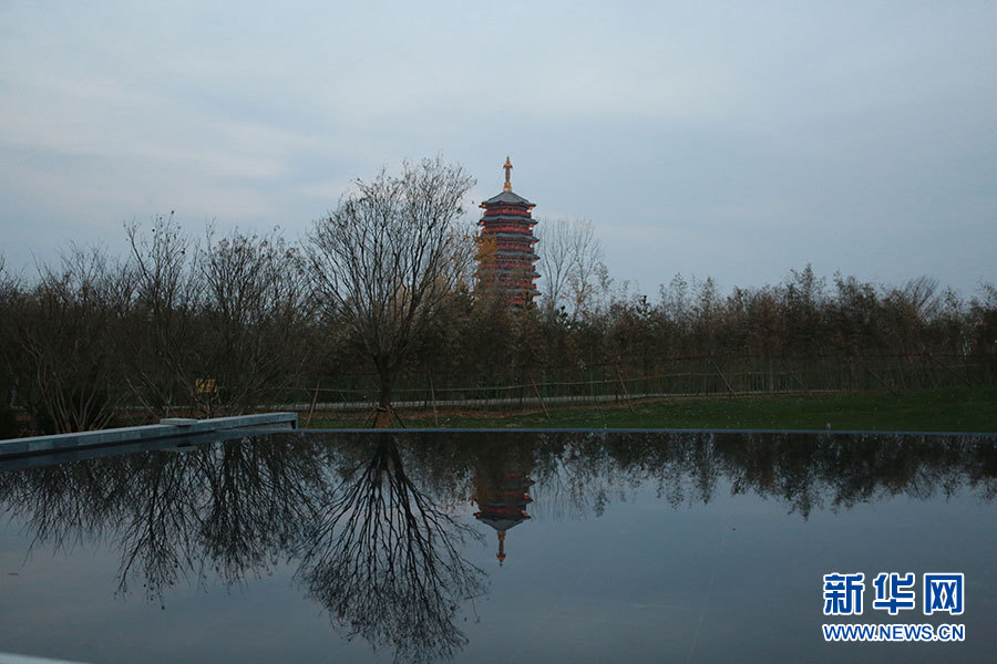 从新闻中心遥望雁栖塔,此塔共九层,呈八边形,由木结构加混凝土构成。雁栖塔的彩绘也沿用了古法,全部由手工一点点绘制而成。新华网记者 王帅(2014年11月10日摄)