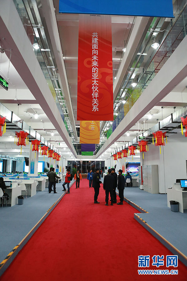 北京APEC雁栖湖新闻中心 媒体公共工作区 新华网记者 王帅摄(2014年11月10日摄)