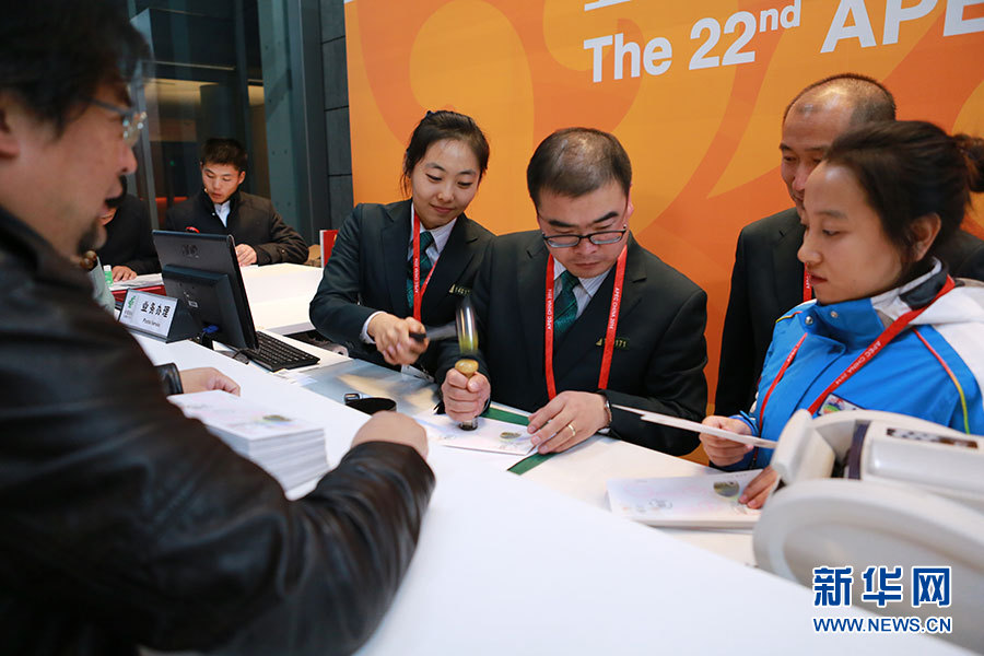 北京APEC雁栖湖新闻中心邮局 工作人员正在首日封上盖邮戳 新华网记者 王帅摄(2014年11月10日摄)