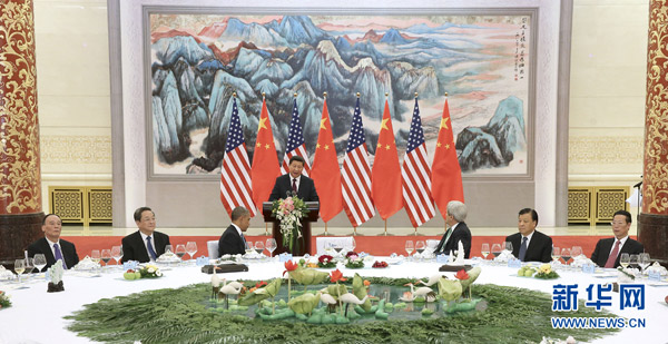 11月12日,国家主席习近平在北京人民大会堂举行宴会,欢迎美国总统奥巴马来华进行国事访问。俞正声、刘云山、王岐山、张高丽出席。 新华社记者 庞兴雷 摄