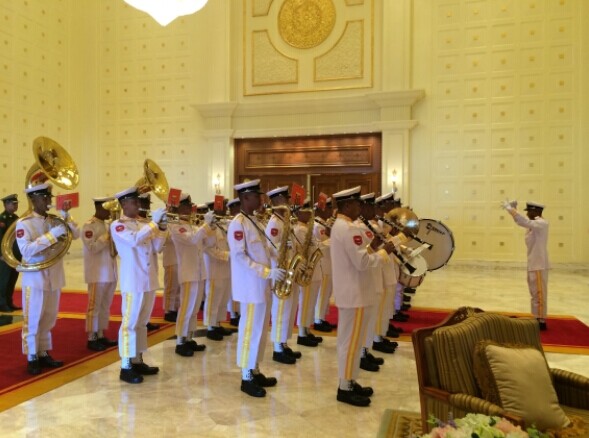 11月14日,缅方军乐队在为李克强总理举行的欢迎午宴上奏响两国国歌。