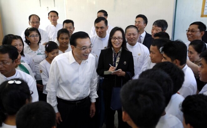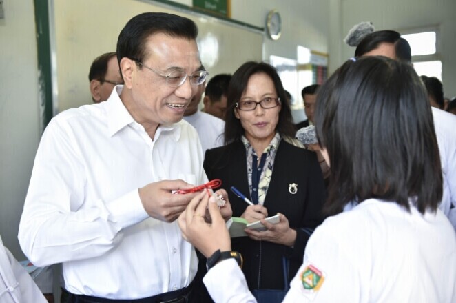 11月14日,克强总理来到内比都第十四中学与青少年们交流。