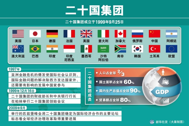 可以说,中国成功地引领了亚太区域合作方向与政策制定,极大地增强了中国在亚太治理中的发言权。如果说,APEC是一个成员限于亚太地区的区域性治理平台,那二十国集团(G20)就是一个覆盖面更广的、全球性的治理平台。G20由西方七国集团、俄罗斯和中国等主要新兴经济体组成,经济规模约占全球90%,贸易总额占全球总量的80%。
