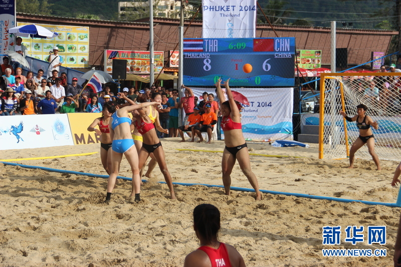 11月16日,中国沙滩手球运动员宫艳(左二)在比赛中掷球瞬间。中国体育代表团16日在泰国普吉举行的第四届亚洲沙滩运动会上勇夺2枚金牌和2枚铜牌。当天比赛全部结束时,中国队以3金2银5铜的成绩暂列奖牌榜第五。新华社发(塔纳摄)